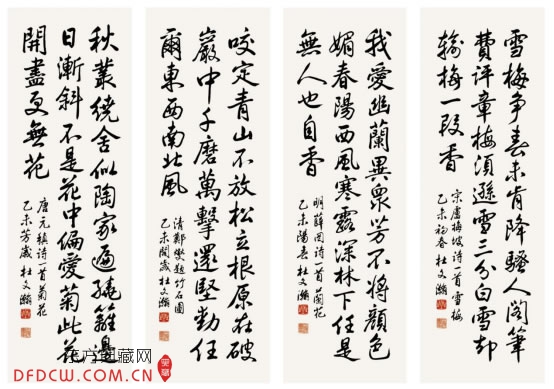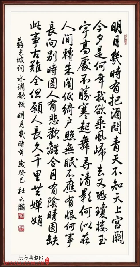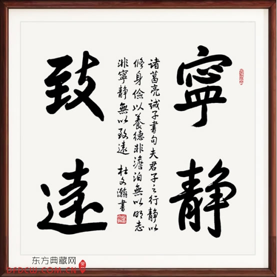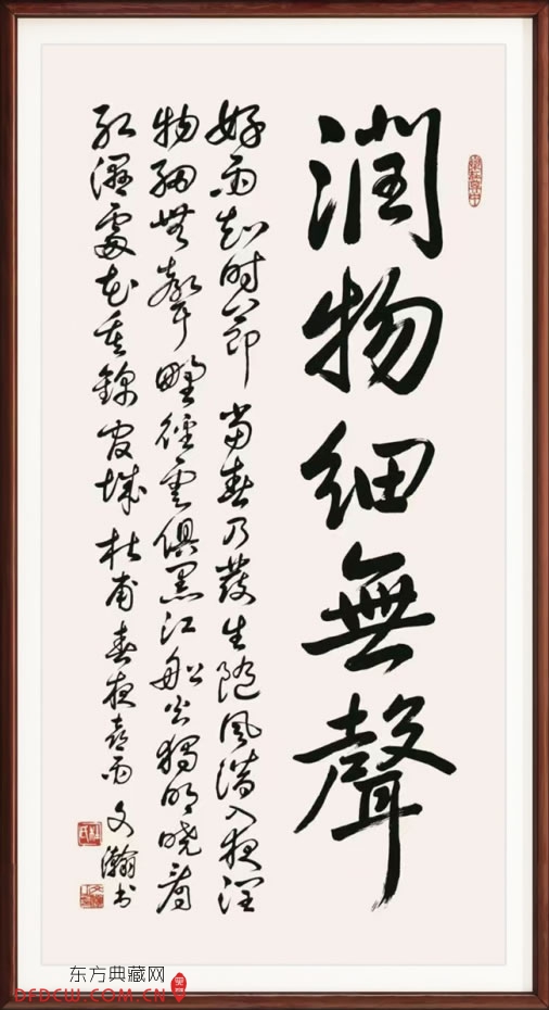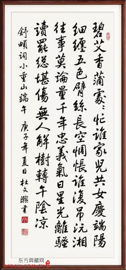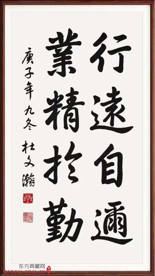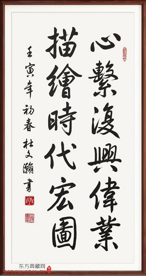 杜文瀚(汉)1942年生于天津,国家一级美术师,中华人民共和国书画大家,“国家特级文艺导师”,中央美术学院客座教授,博鳌亚洲艺术人才研究中心研究员,中国楹联学会常务理事,中国书画家协会终身名誉主席。其绘画作品涉猎多个画种,中西融合,画风严谨。书艺取法高古、上追秦汉魏晋、熔铸历代名家精华,书法创作敬畏传统,功力深厚。在创作中坚持真善美的格调,古拙端庄、俊秀洒脱的书风。书法作品具有浓厚的审美理想和浪漫精神以及强烈的时代风貌和独特风格。